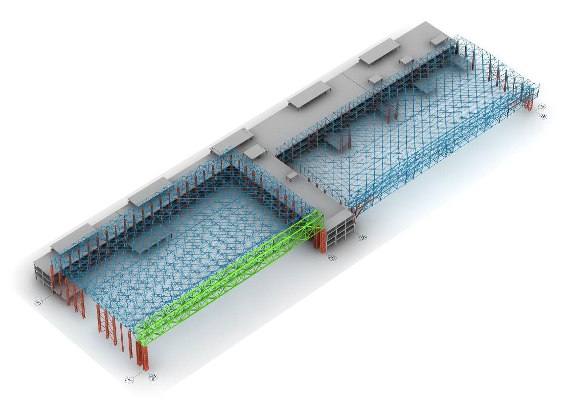 機(jī)庫(kù)大廳為鋼網(wǎng)架+鋼格構(gòu)柱結(jié)構(gòu),附樓為鋼筋混凝土框架結(jié)構(gòu)。1#大修機(jī)庫(kù)由寬體機(jī)庫(kù)、窄體機(jī)庫(kù)、附樓及房中房組成,附樓沿大廳后山墻及兩機(jī)庫(kù)中間全長(zhǎng)貼建。寬體機(jī)庫(kù)結(jié)構(gòu)形式采用大門(mén)桁架+三層斜放四角錐屋蓋網(wǎng)架+鋼格構(gòu)柱+屈曲約束支撐。大門(mén)桁架弦桿截面主要為焊接箱型,大廳屋蓋采用三層斜放四角錐網(wǎng)架結(jié)構(gòu);窄體機(jī)庫(kù)結(jié)構(gòu)形式采用大門(mén)剛架+兩層兩向正交斜放屋蓋網(wǎng)架+鋼格構(gòu)柱+屈曲約束支撐。大門(mén)剛架梁采用三層球管桁架,大廳采用兩層兩向正交斜放網(wǎng)架結(jié)構(gòu)。項(xiàng)目總用鋼量約7700噸。