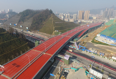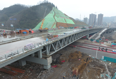 遵義市鳳新快線工程第二標段起點樁號K0+593.5,終點樁號K1+183.5。上層橋梁跨越內(nèi)沙路,外環(huán)路,與川黔線上方跨鐵路橋相接,橋梁總長590米;中層橋梁從內(nèi)沙路路口起橋,跨越外環(huán)路,與川黔線路口平交,中層橋梁起點樁號k0+913.5,終點樁號k1+183.5,橋梁總長270米。