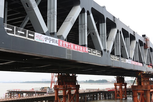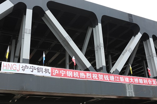 錢塘江新建大橋是滬杭甬高速公路杭州市區(qū)段改建工程節(jié)點控制性工程。大橋跨徑布置為(72+122+4×240+122+72)m,橋梁主跨為240m,全長1348m,是國內(nèi)首座多跨長聯(lián)公軌兩用懸鏈形上加勁鋼桁梁橋。全橋用鋼量約6.2萬噸,滬寧鋼機(jī)承擔(dān)約2.7萬噸的制作任務(wù)。