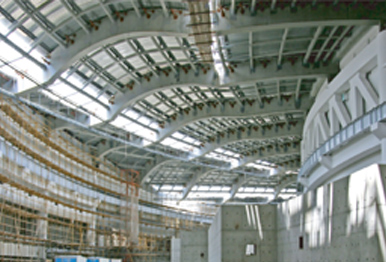 上海光源工程-同步輻射工程(SSRF)位于上海市張江高科技園區(qū),是國(guó)家重大科學(xué)裝置,可以應(yīng)用同步輻射光進(jìn)行基礎(chǔ)學(xué)科研究和應(yīng)用學(xué)科的研究。一期工程總建筑面積為50648平方米。主體建筑占地30166平方木,建筑面積約36625平方米,最高處為20米。主體建筑鋼結(jié)構(gòu)部分主要有異性鋼屋蓋和環(huán)形吊車梁系統(tǒng)組成,整體造型宛如美麗的“鸚鵡螺”,結(jié)構(gòu)造型獨(dú)特。